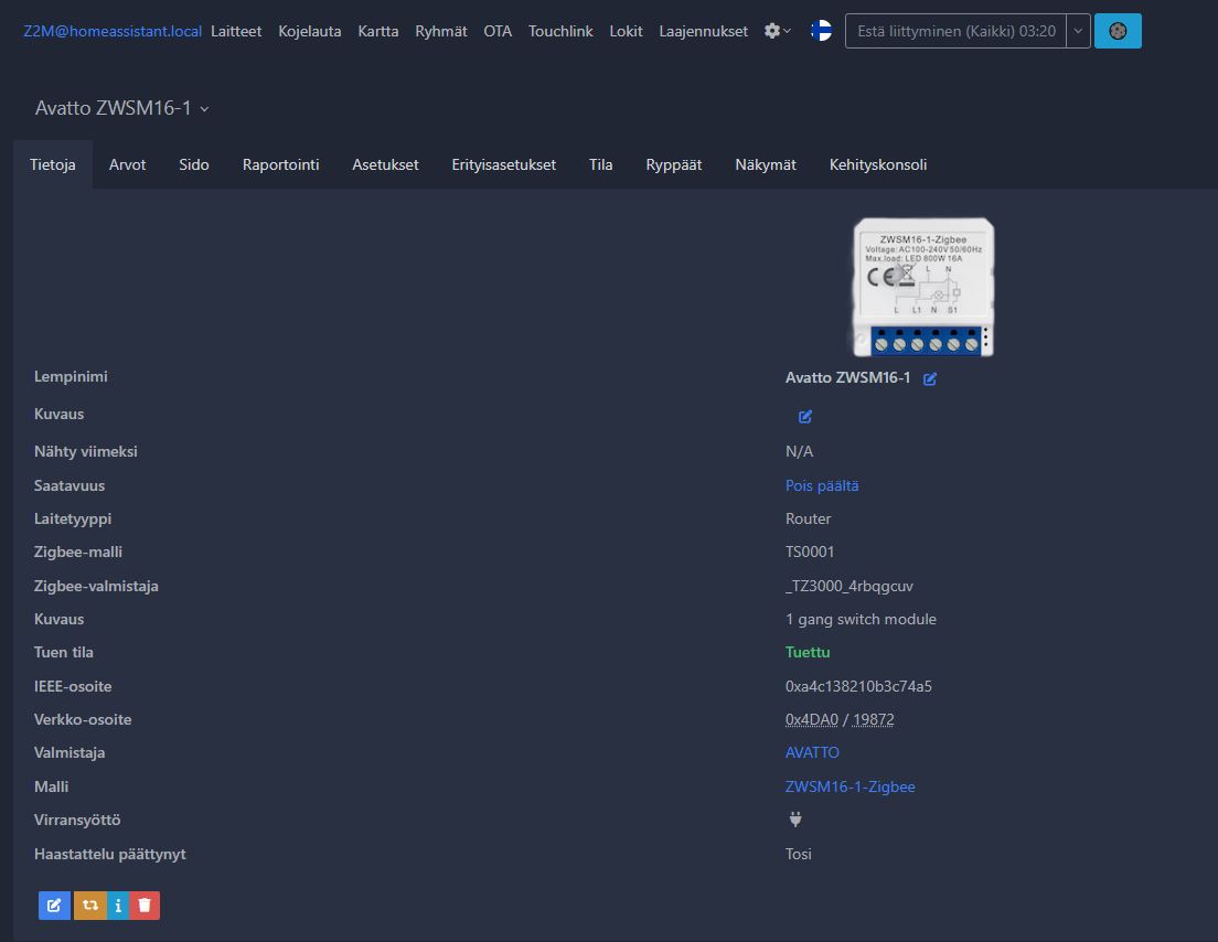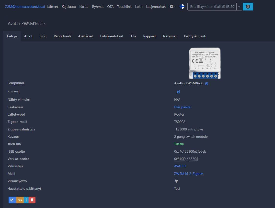 - Toiminnot laajennettavissa Zigbee2MQTT‑integraation kautta, kuten ajastukset ja virrankäyttäytyminen virran palatessa
