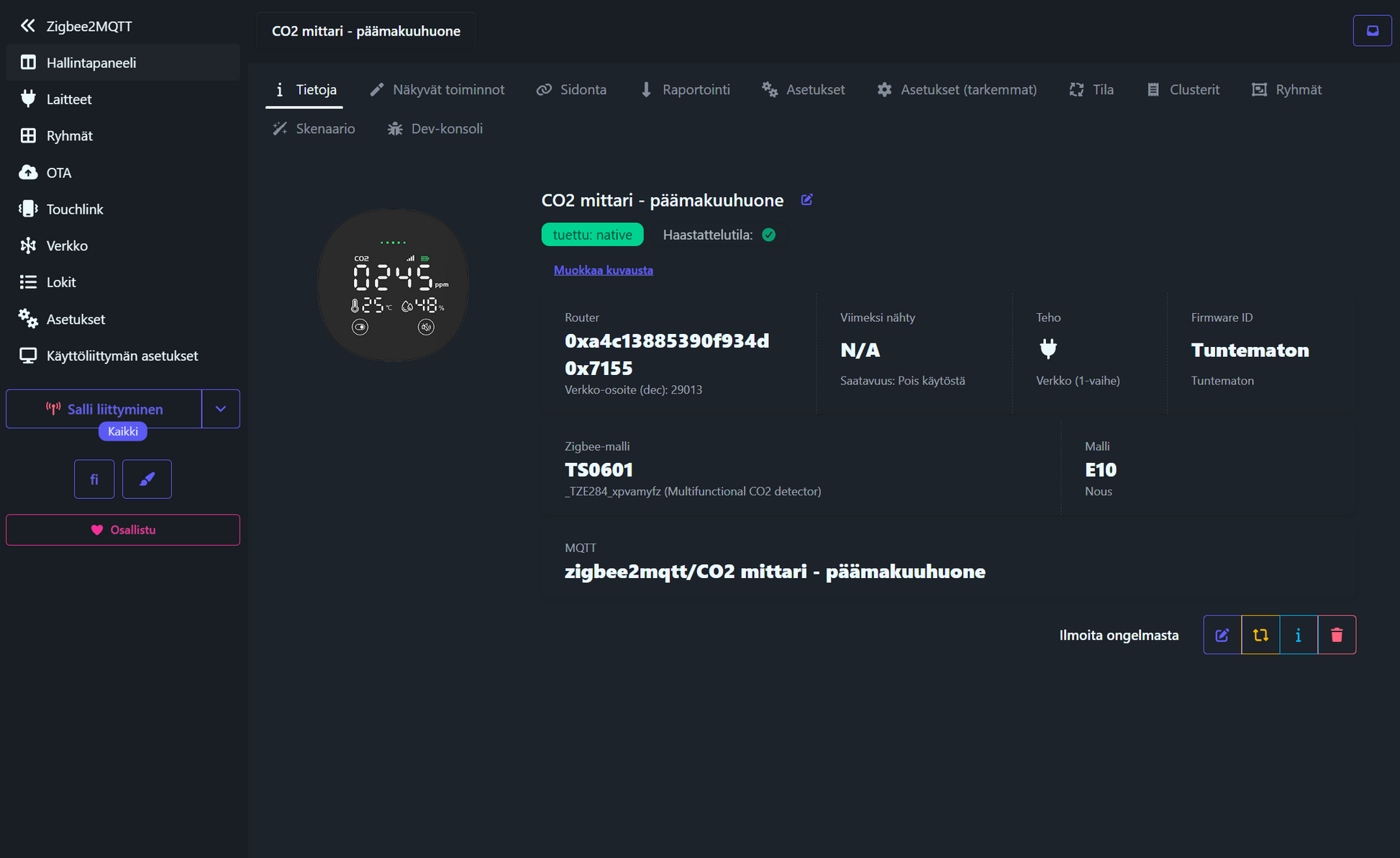 - Toimii Zigbee2MQTT:ssä (testattu) sekä Tuya Smart Life/Nous-sovelluksissa Zigbee sillan kautta