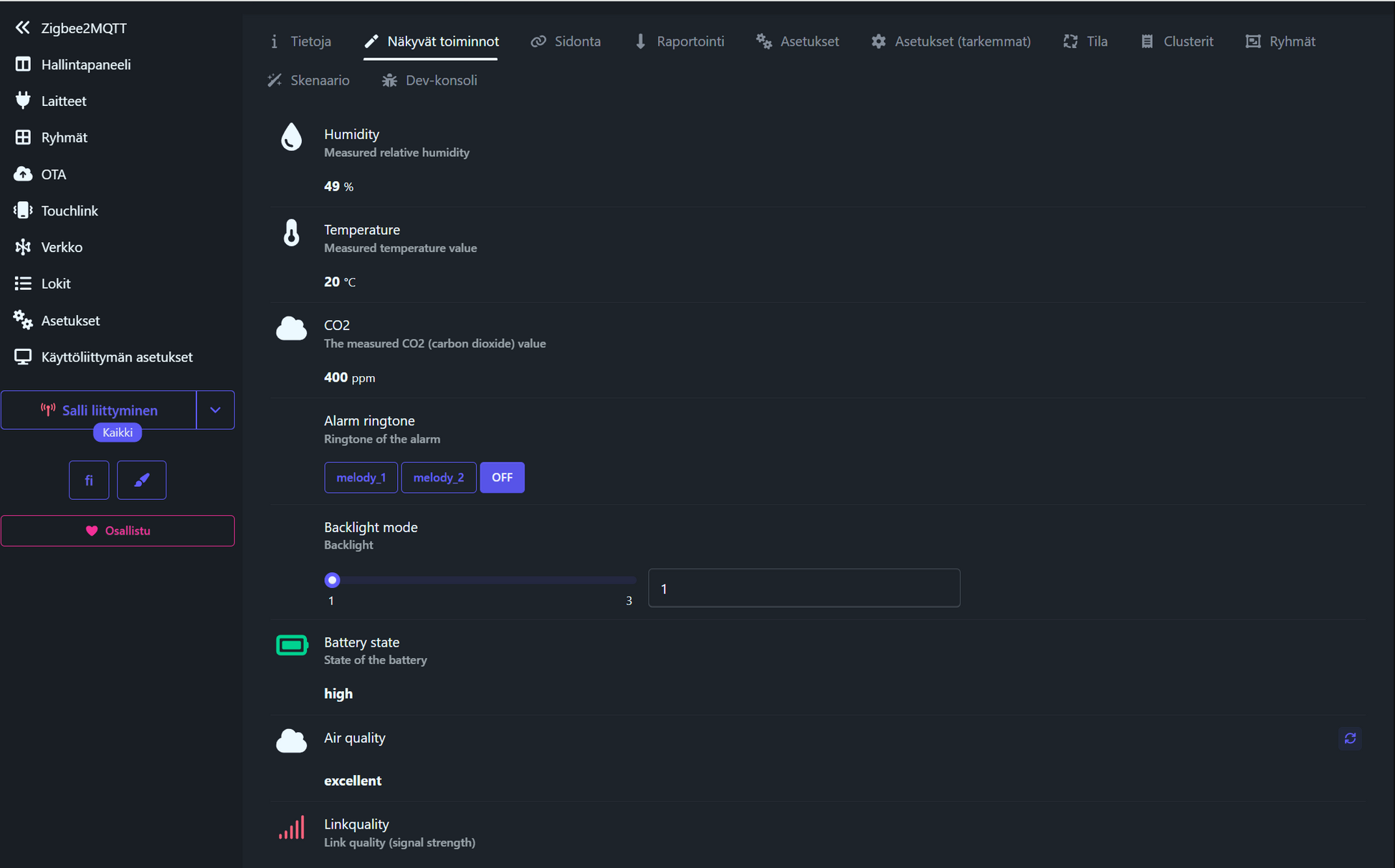 co2,temperature,humidity,air_quality - Ilmanlaadun tila: excellent / moderate / poor