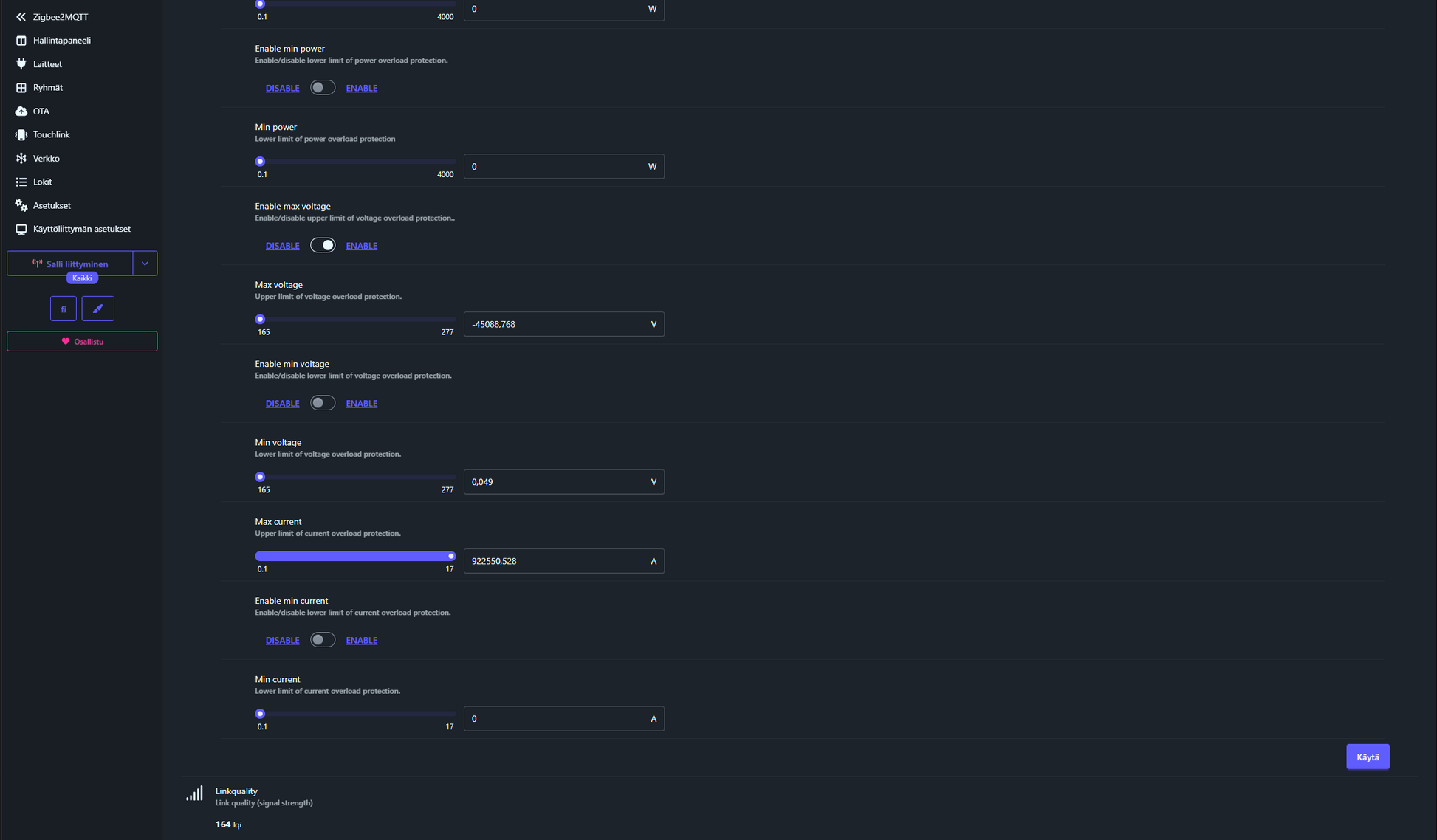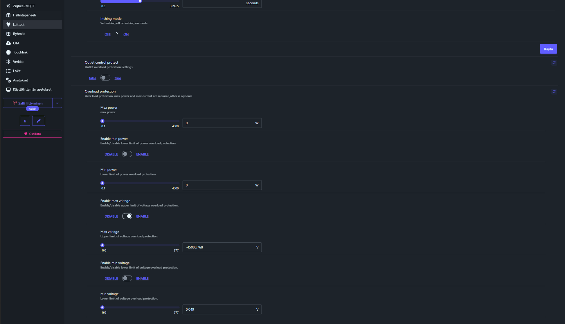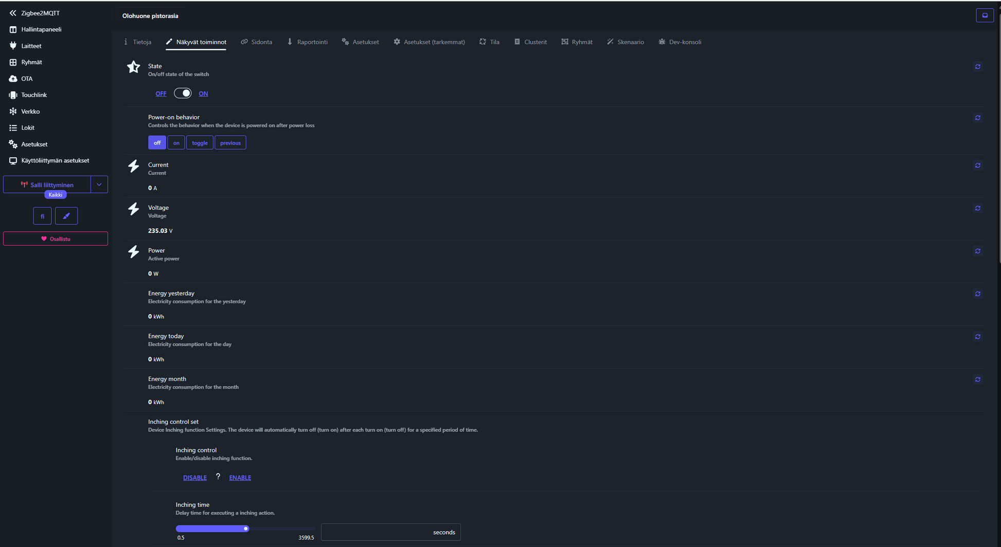 - Energiadata: Reaaliaikainen virta, jännite, teho ja kWh-kulutus