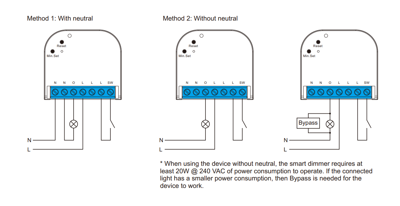 Huomioi, että hyvin pienillä LED-kuormilla saatat tarvita erillisen bypass-komponentin, jotta valo sammuu varmasti eikä vilku pienillä himmennystasoilla. Jos käytät himmennintä ilman nolljohtoa, täytyy kuorman olla vähintään 20W.
