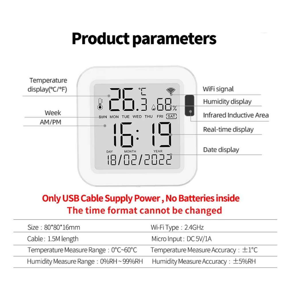MOES Tuya WiFi lämpötila- ja kosteusanturi (USB, LCD-näyttö)